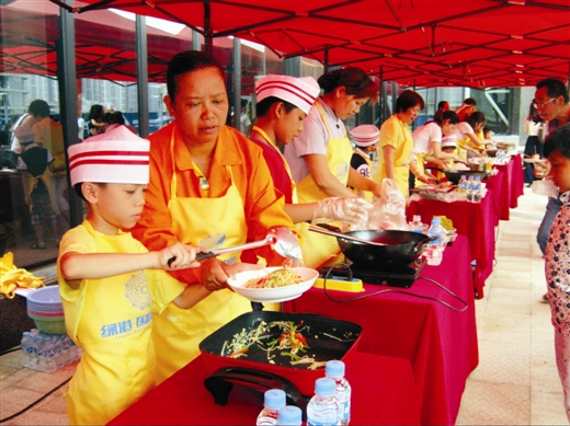 本報(bào)訊 昨日上午,南寧經(jīng)濟(jì)技術(shù)開發(fā)區(qū)在綠港·國際中心開展了以“關(guān)愛農(nóng)民工·綠港小廚神”親子活動,吸引了南寧經(jīng)開區(qū)園林綠化工人、水電維修物業(yè)工人、保潔人員等300多名進(jìn)城務(wù)工人員及其子女參加。在活動現(xiàn)場,參賽小選手們在父母的指導(dǎo)下井井有條地備菜、炒菜、起鍋,忙得不亦樂乎。