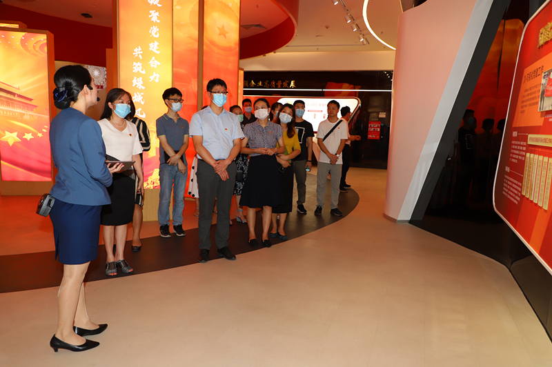 黨建文化示范中心講解員向綠港集團(tuán)考察團(tuán)講解黨建品牌的特色打造